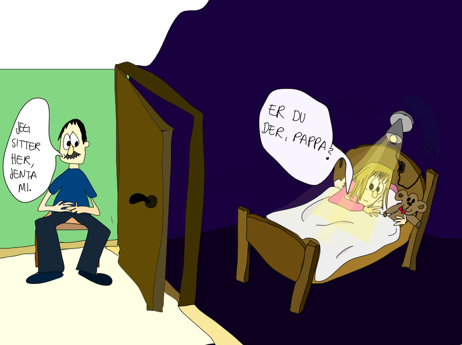 Pappa satt ofte i trappen utenfor rommet mitt da jeg var liten. «Er du der», spurte jeg. «Ja, jeg sitter rett her», svarte han… om og om igjen til jeg sovnet. I mørket så jeg at konturene av klærne mine over en stol ble til skumle fjes som glante på meg. De gjorde meg aldri noen ting, men jeg likte ikke at de stirret.